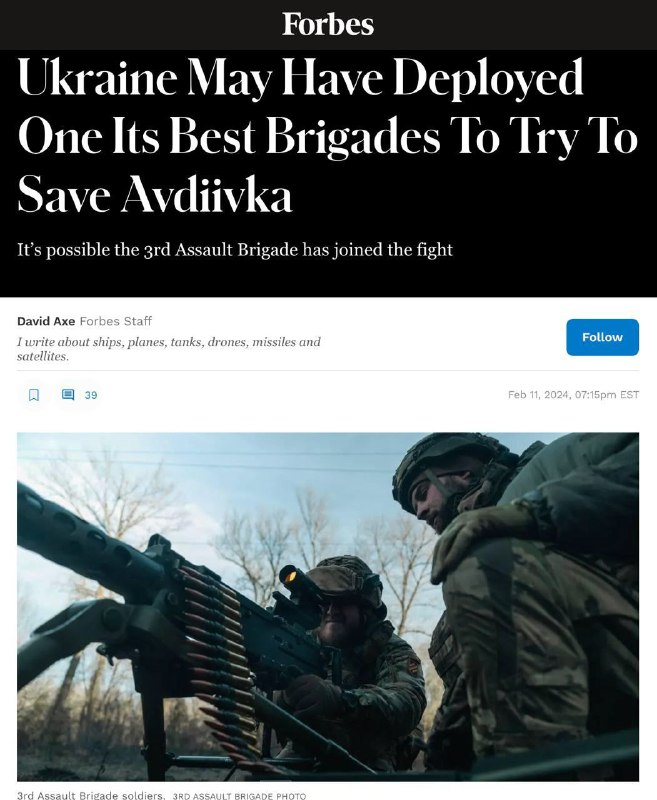 Forbes сообщает, что Украина, возможно, перебросила в Авдеевку «одну из своих лучших бригад» — 3-ю штурмовую бригаду, более известную как…